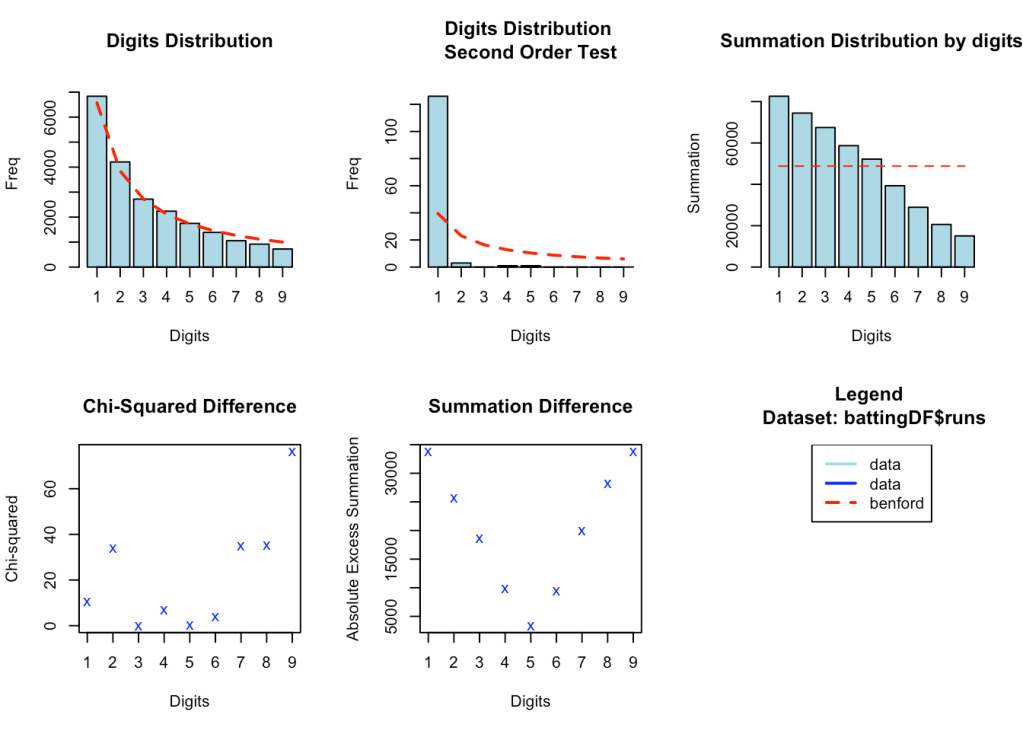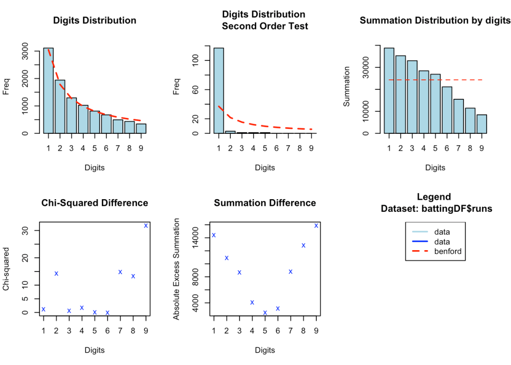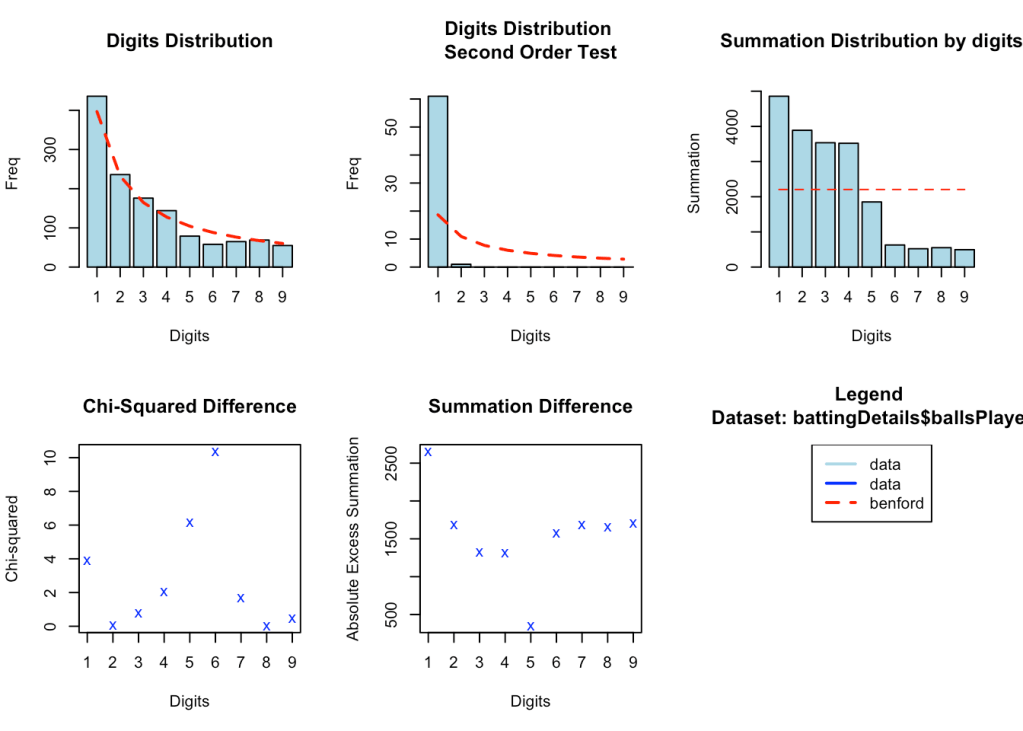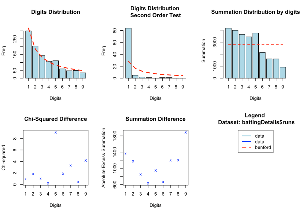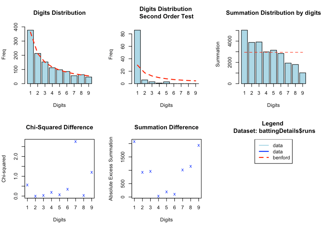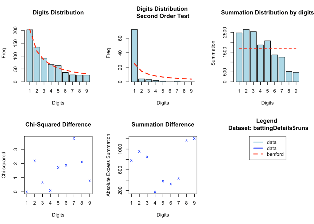 While it cannot be said with absolute certainty, marked deviations from Benford’s law could possibly indicate that there has been manipulation of natural processes. Possibly Benford’s law could be used to detect large scale match-fixing in cricket tournaments. However, we cannot look at this in isolation and the other statistical and forensic methods may be required to determine if there is fraud. Here is an interesting paper Promises and perils of Benford’s law